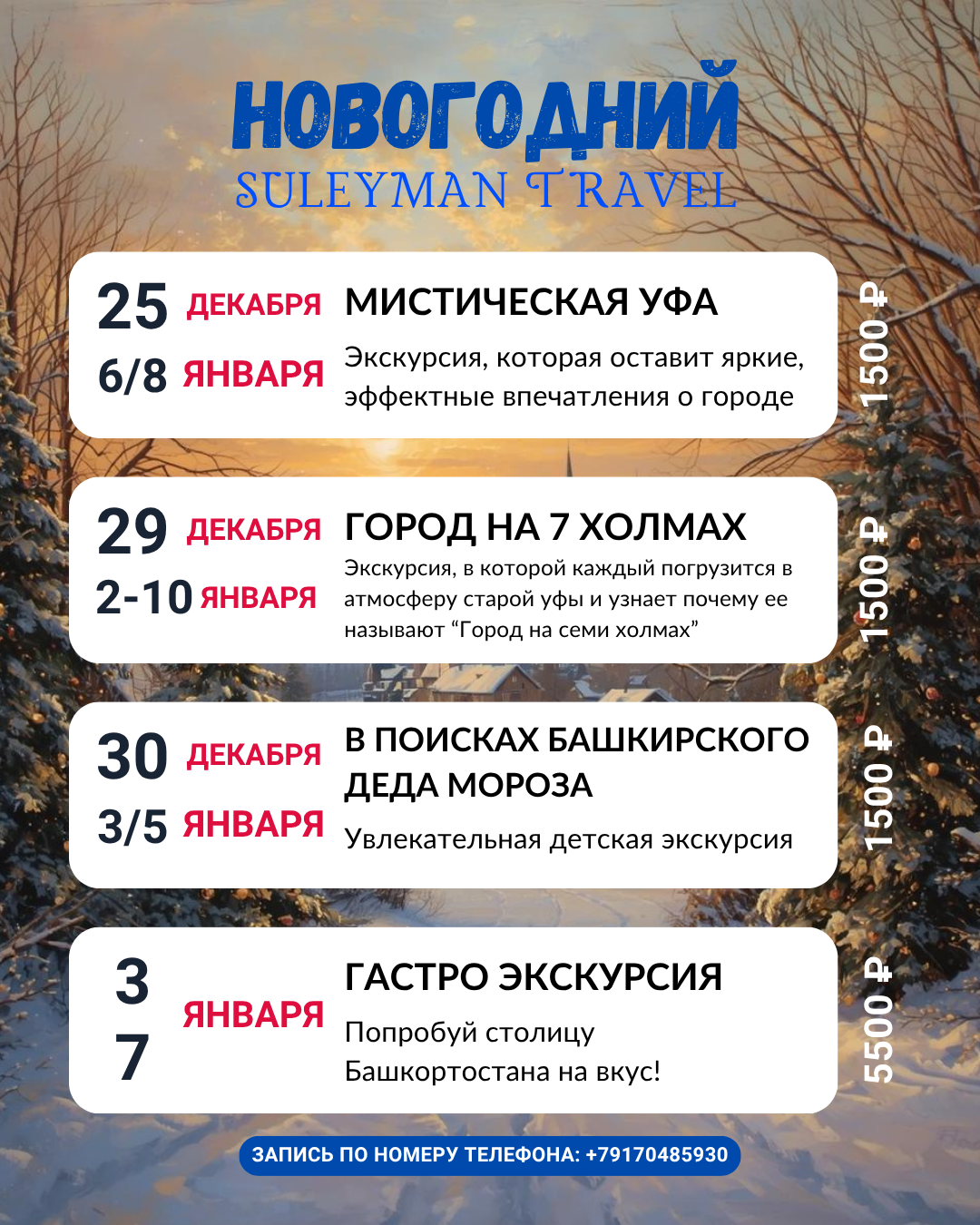 Новогодние праздники — отличное время, чтобы провести время с семьёй и получить массу впечатлений. Сулейман Трэвел предлагает интересные и незабываемые экскурсии, которые помогут вам провести это время с пользой и удовольствием. Пора задуматься, чем занять себя и свою семью на новогодних праздниках — приходите на наши экскурсии!